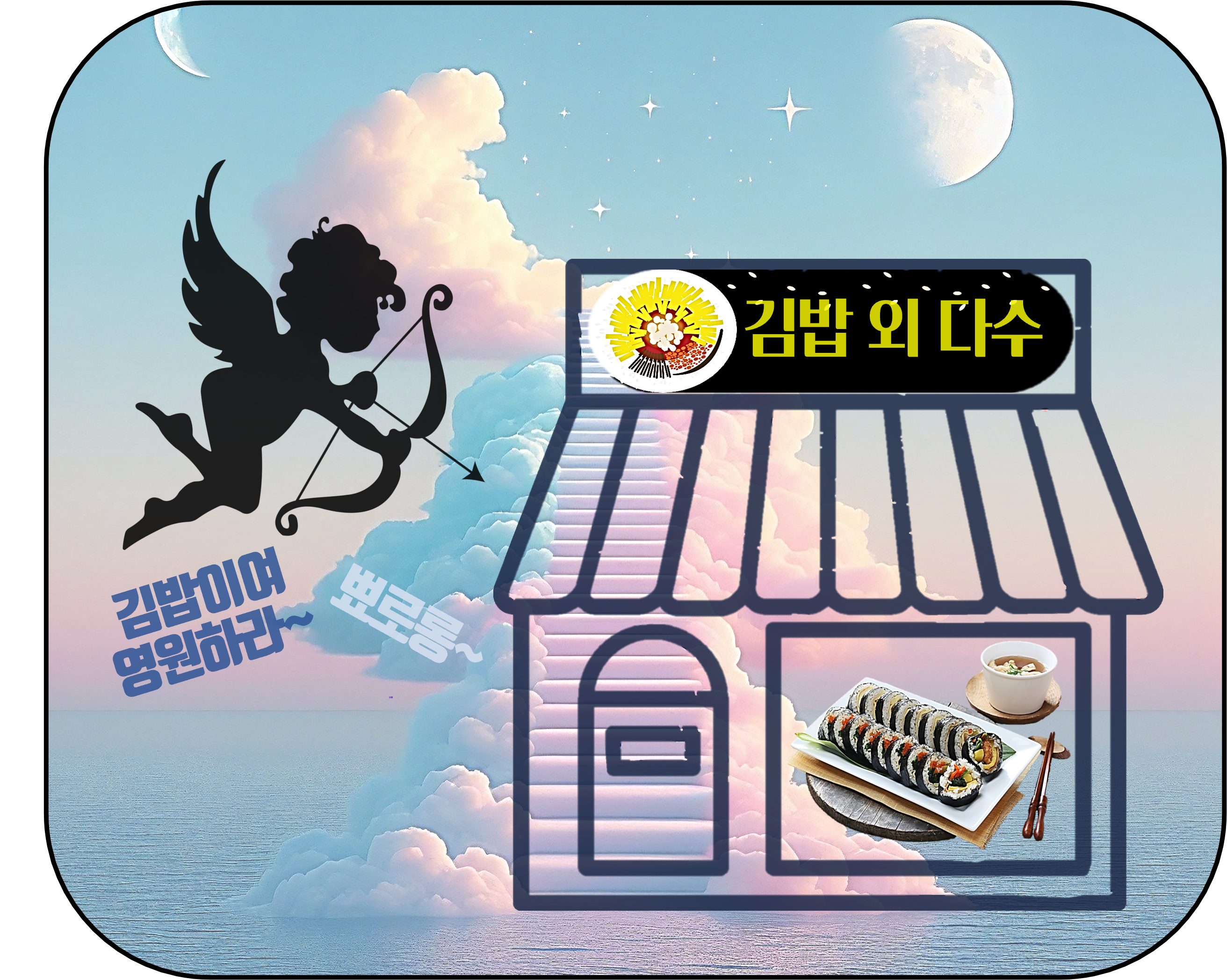 홀로 점심을 먹다 보니 혼자 물어보고 혼자 답하는 것도 지루해서 사무실의 현실과 반대되는 식당이라도 천국에 가봐야겠다는 마음으로 김밥을 파는 천국에 가서 하루에 한 메뉴씩 위로를 받았습니다.
