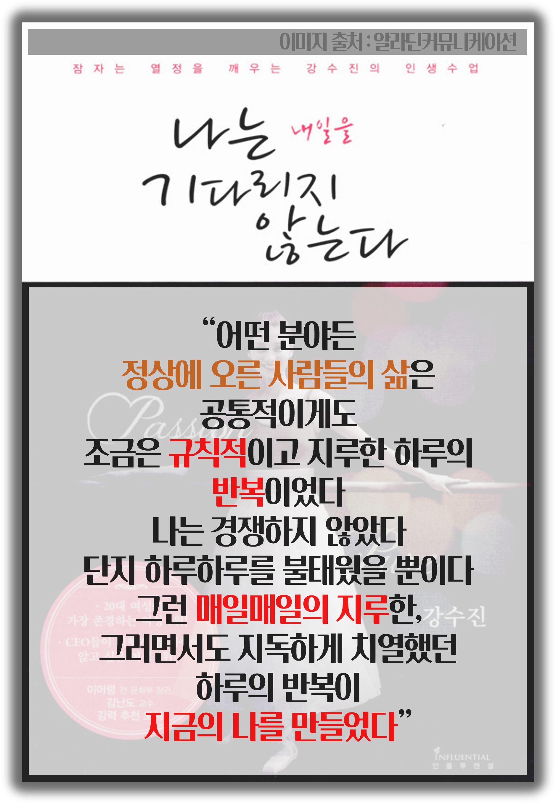 발레리나 강수진님께서 [ 나는 내일을 기다리지 않는다 ]라는 책에 쓰신 글귀가 있는데요.