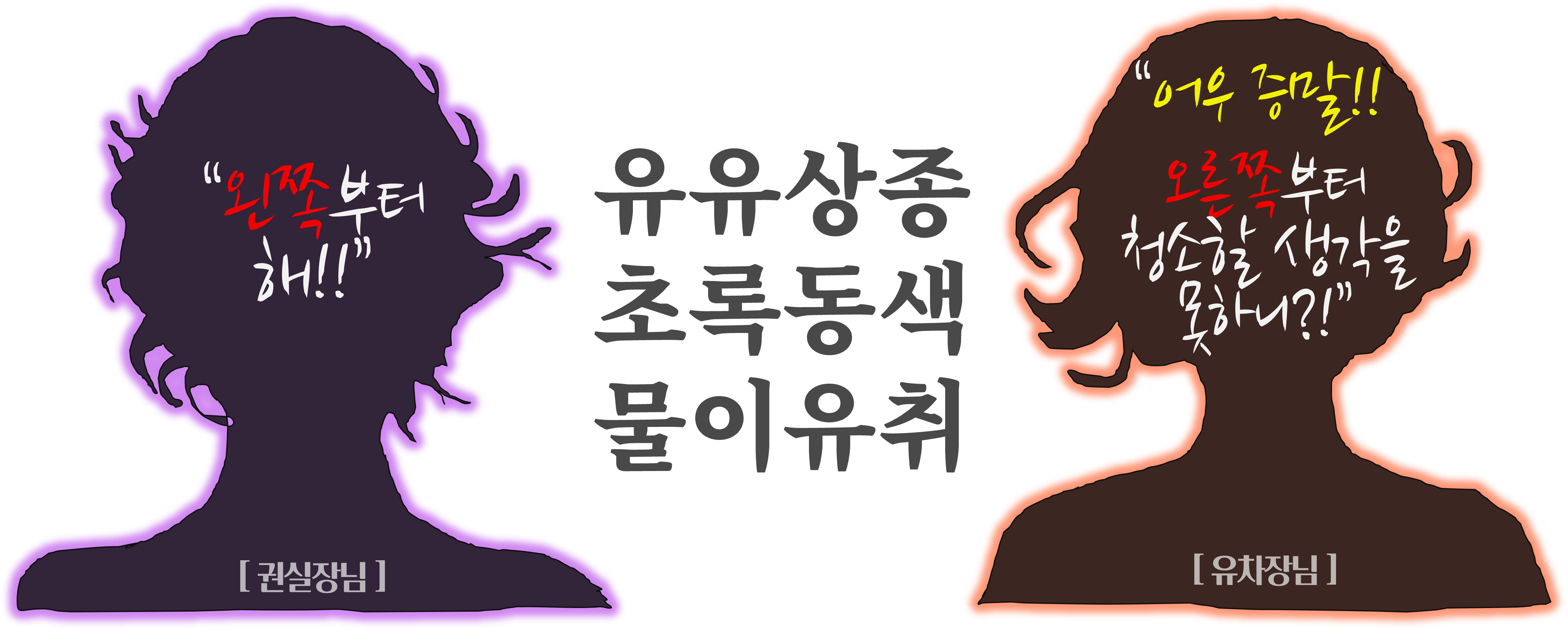 직원들이 사무실 청소를 하는 날에는 한 분이 왼쪽부터 청소기를 밀라고 하셔서, 다음 청소 때도 같은 방식으로 했더니 이번에는 다른 한 분이 오른쪽부터 청소해야지 왜 왼쪽부터 하냐면서 답답해하셨습니다.